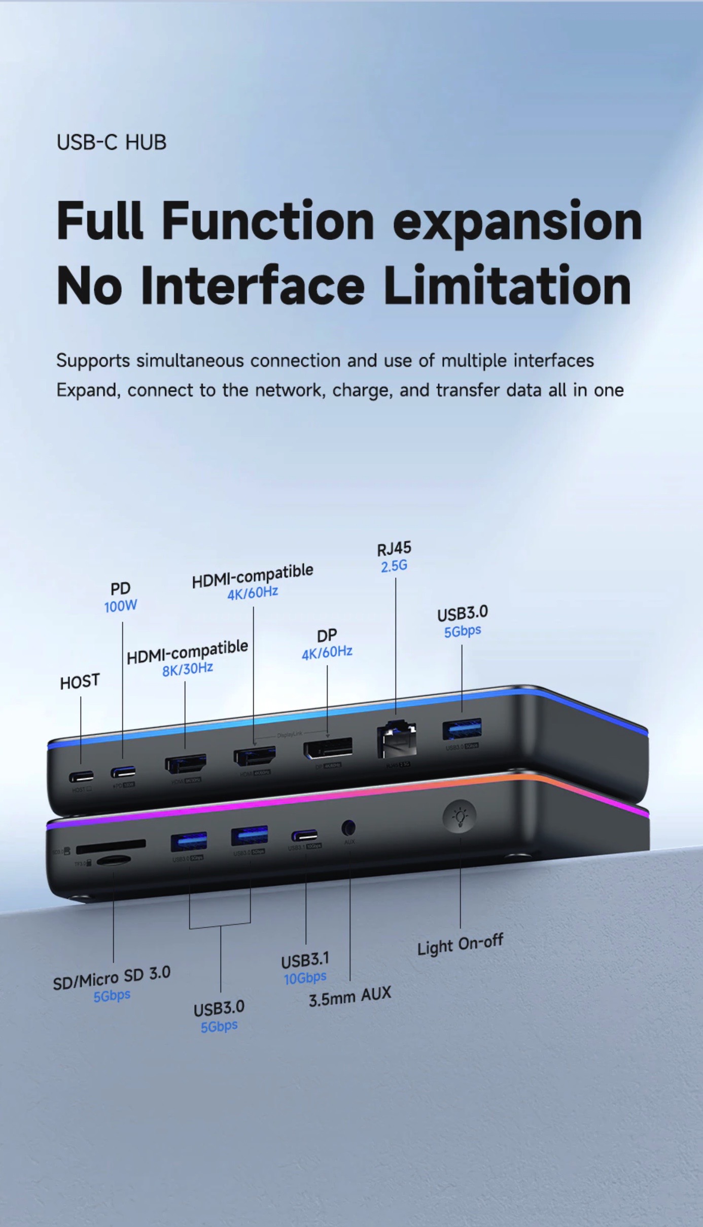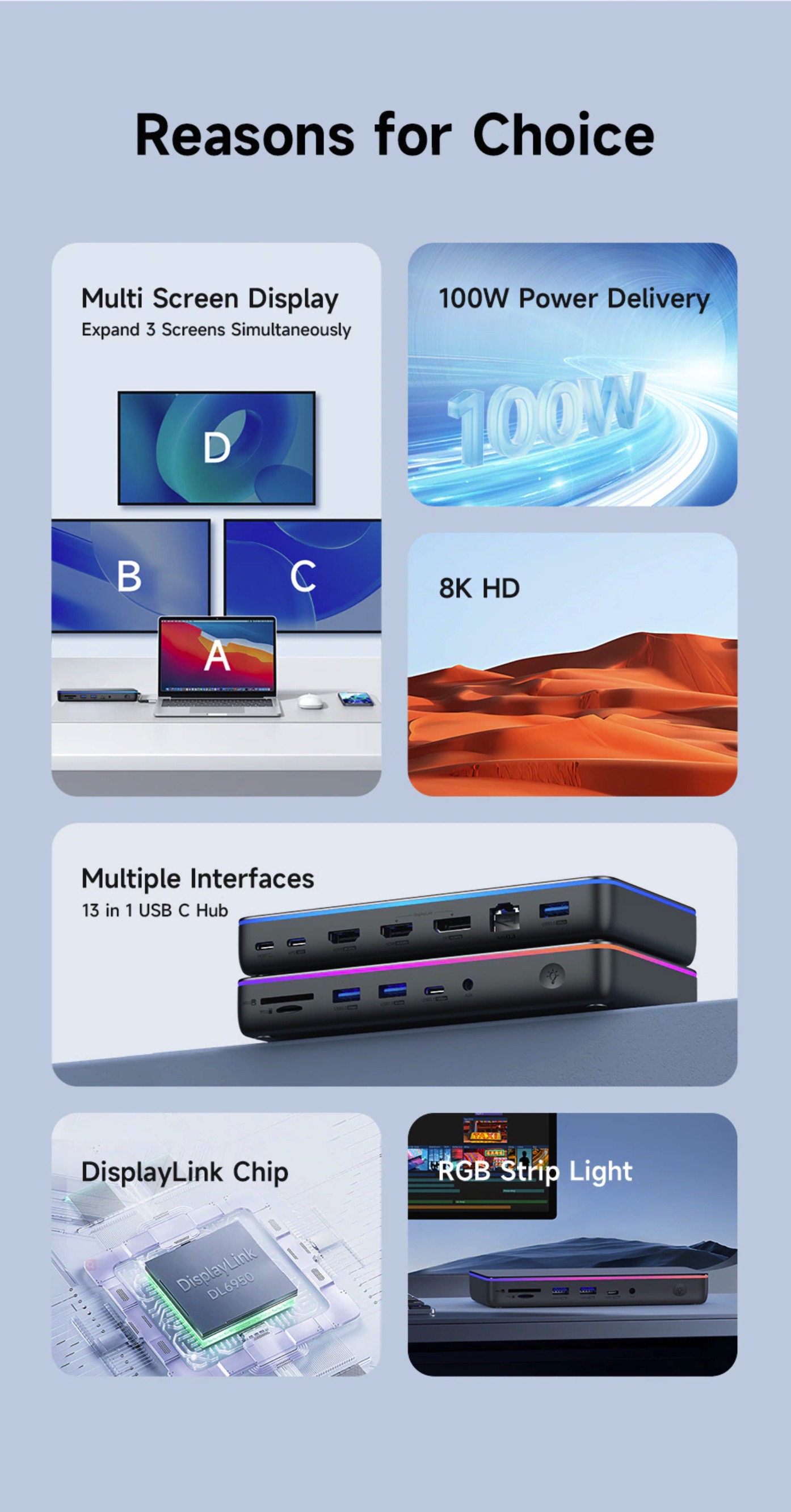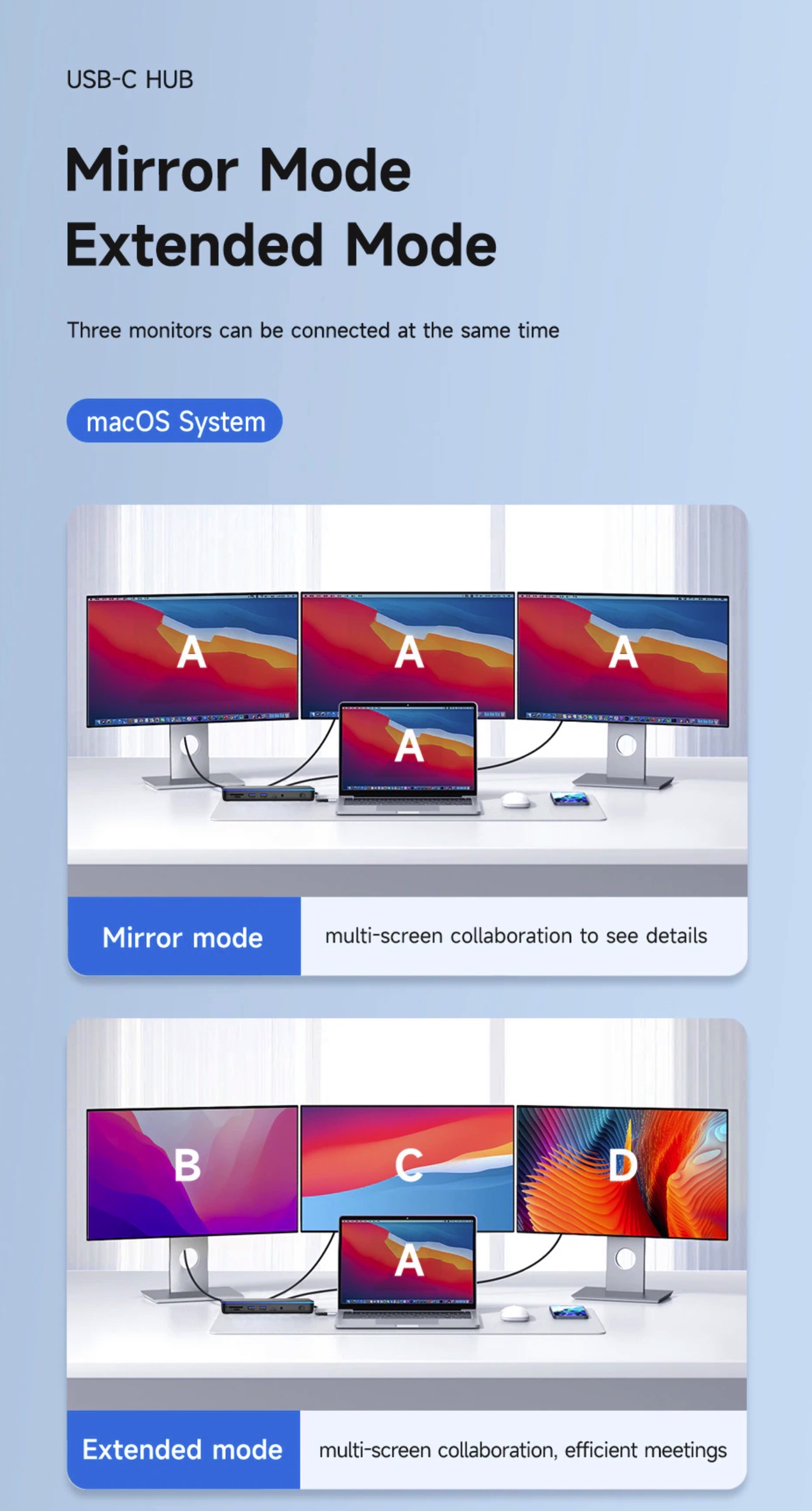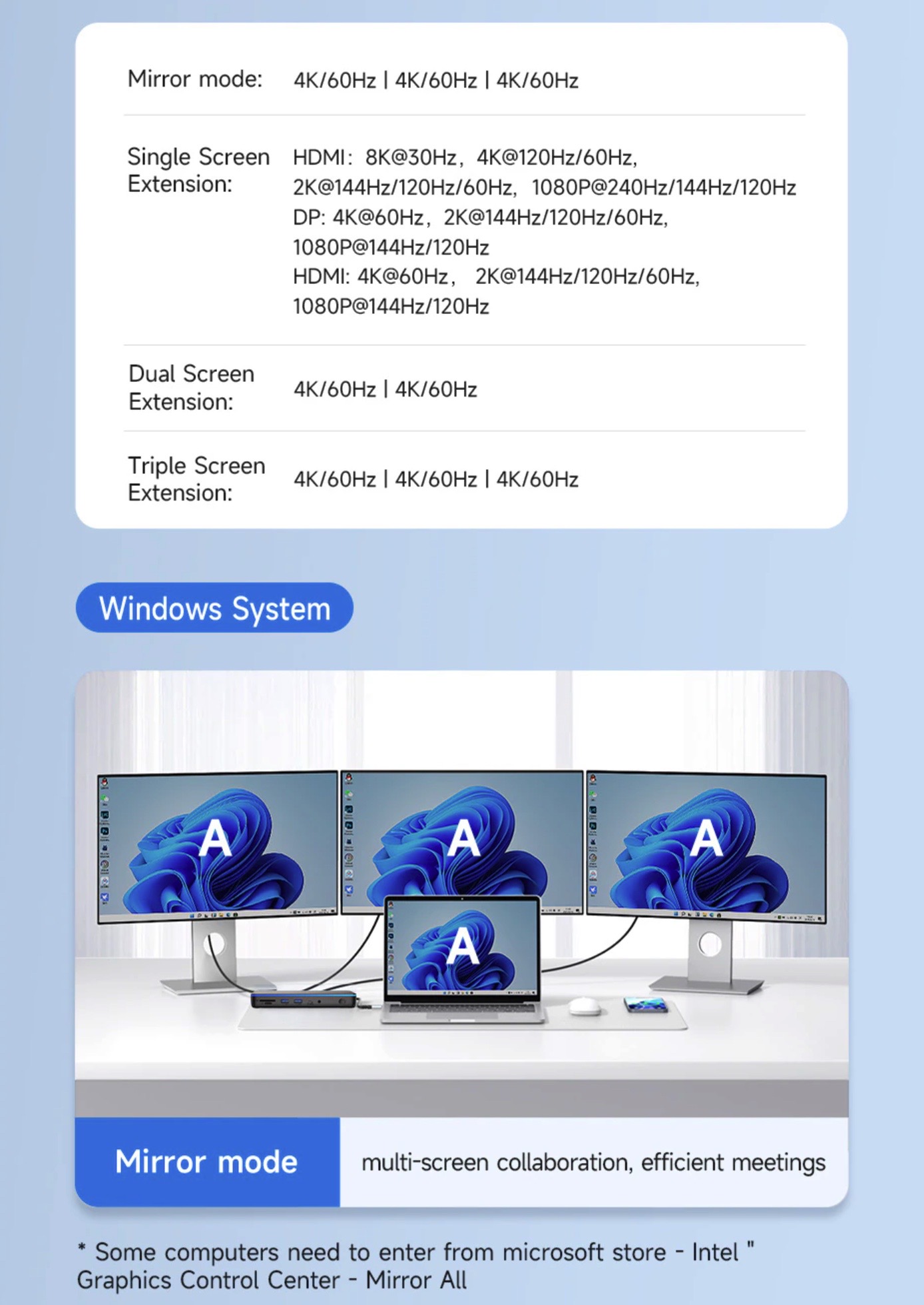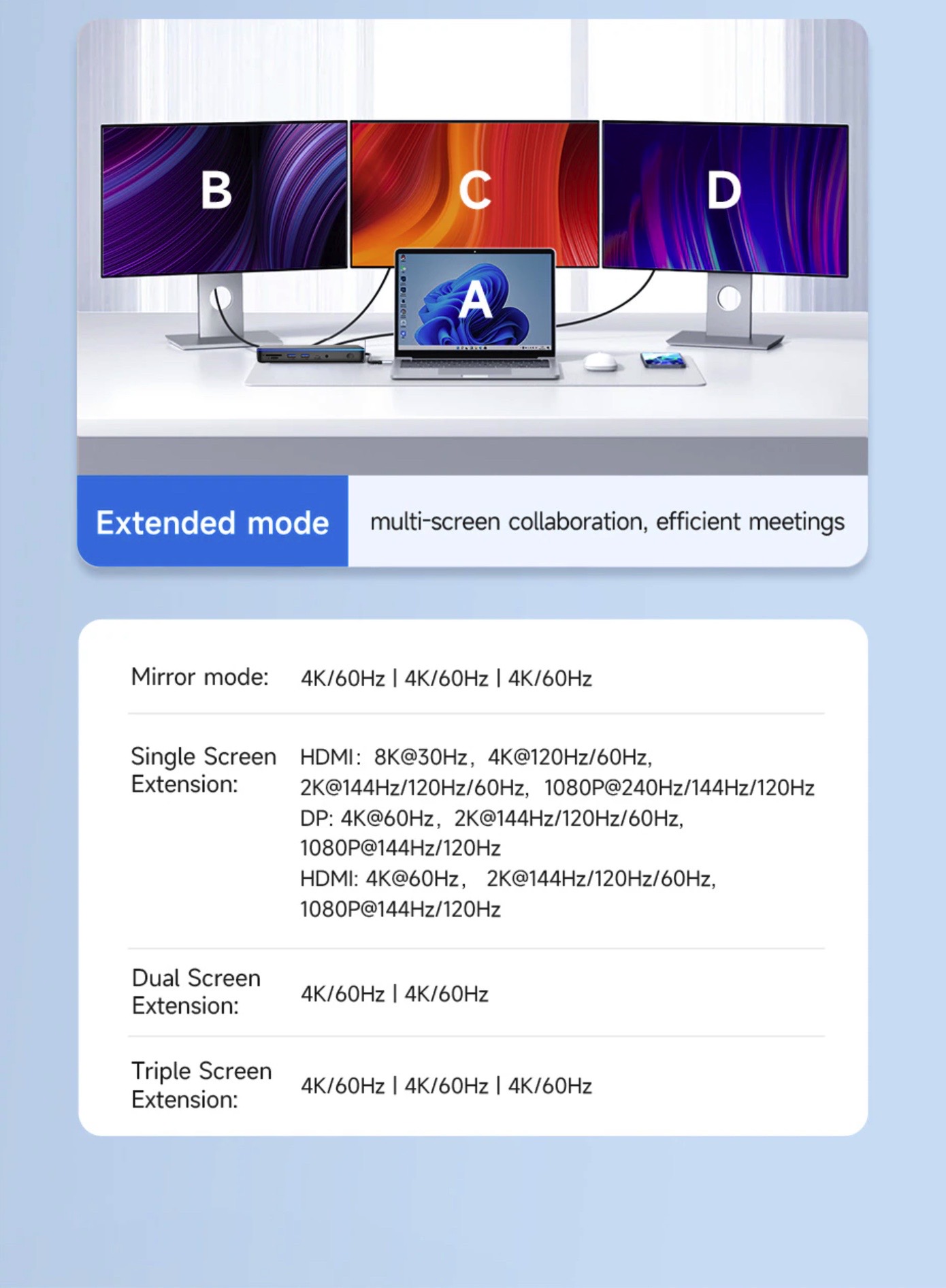 Mirroring /Extended Dual Mode: Feel free to choose an external monitor to display the same or different content to enhance your productivity! In Mirroring mode, all video interfaces support 4K@60Hz output only; In extended mode, when only one additional monitor is connected, the HDMI interface can support up to 8K@30Hz output, and when two or three additional monitors are connected at the same time, all video interfaces support 4K@60Hz output only