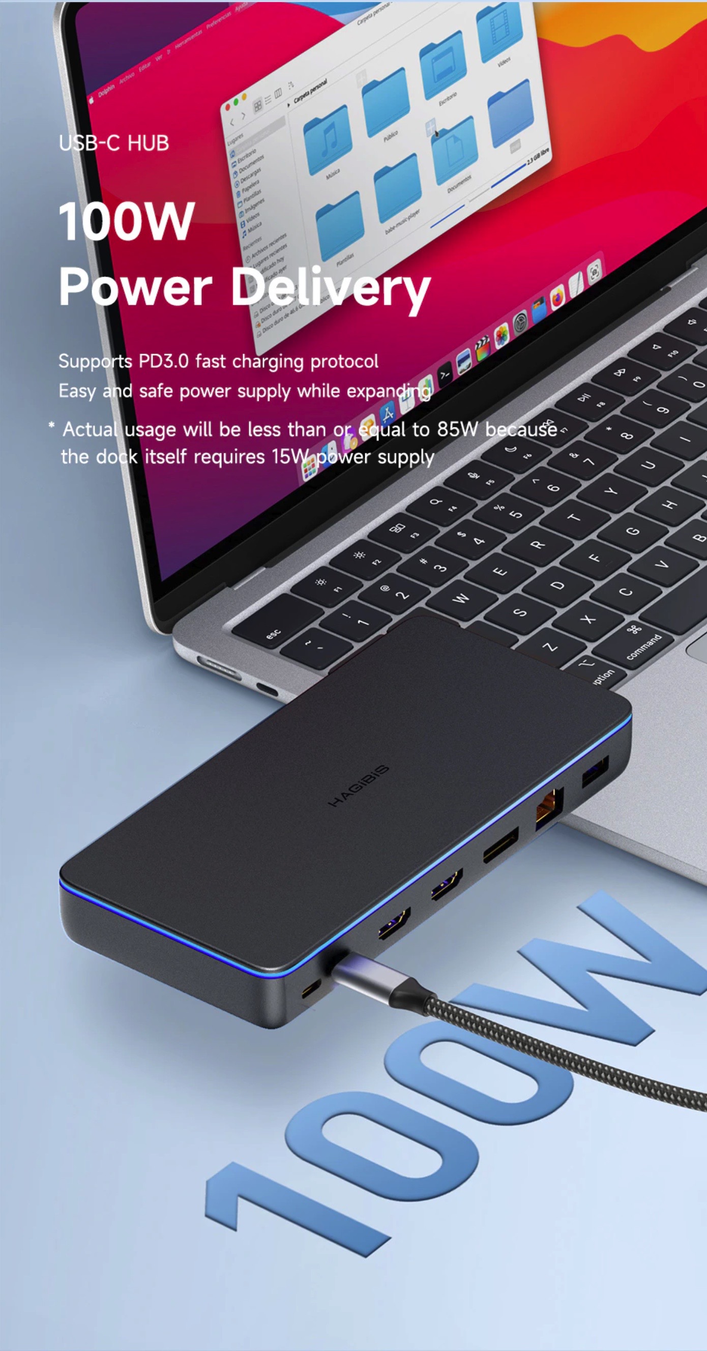 100W PD Fast charging: This port is used to provide power to your laptop and other devices that support PD charging protocol, and it also provides part of the power for the stable operation of the docking station, so please connect a PD charger to the docking station when you use it