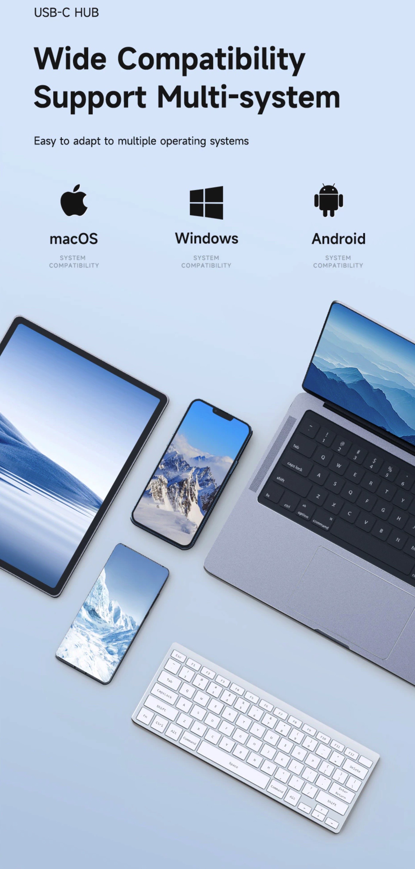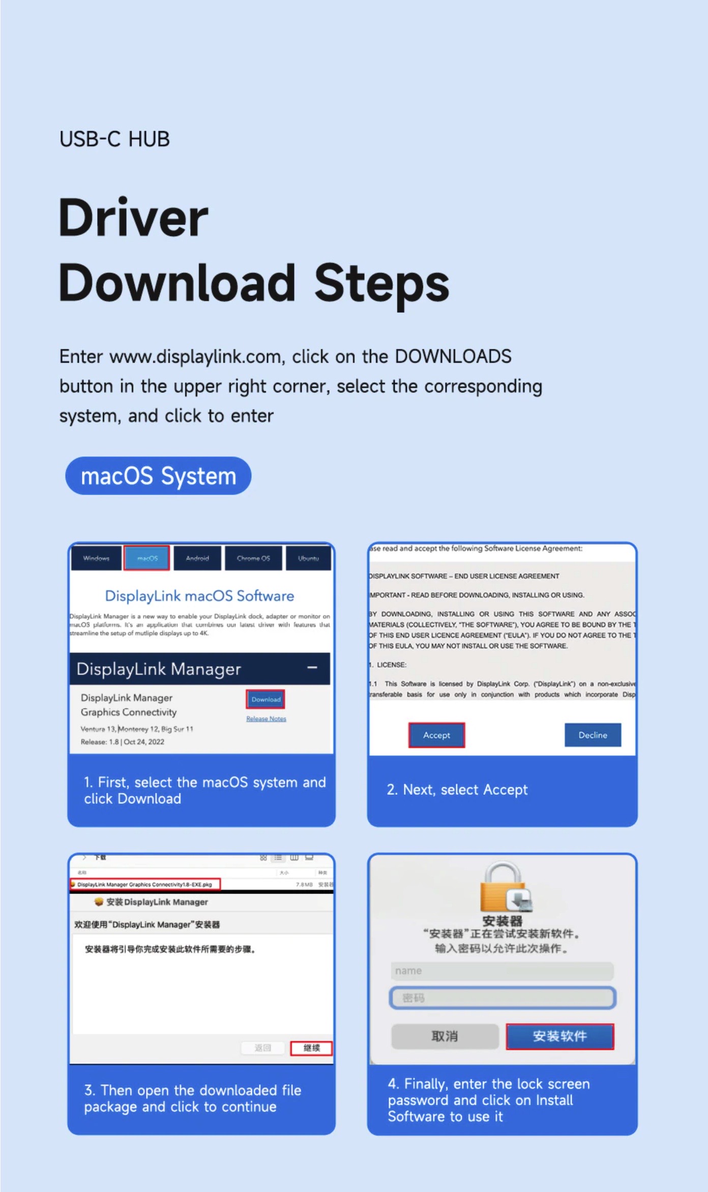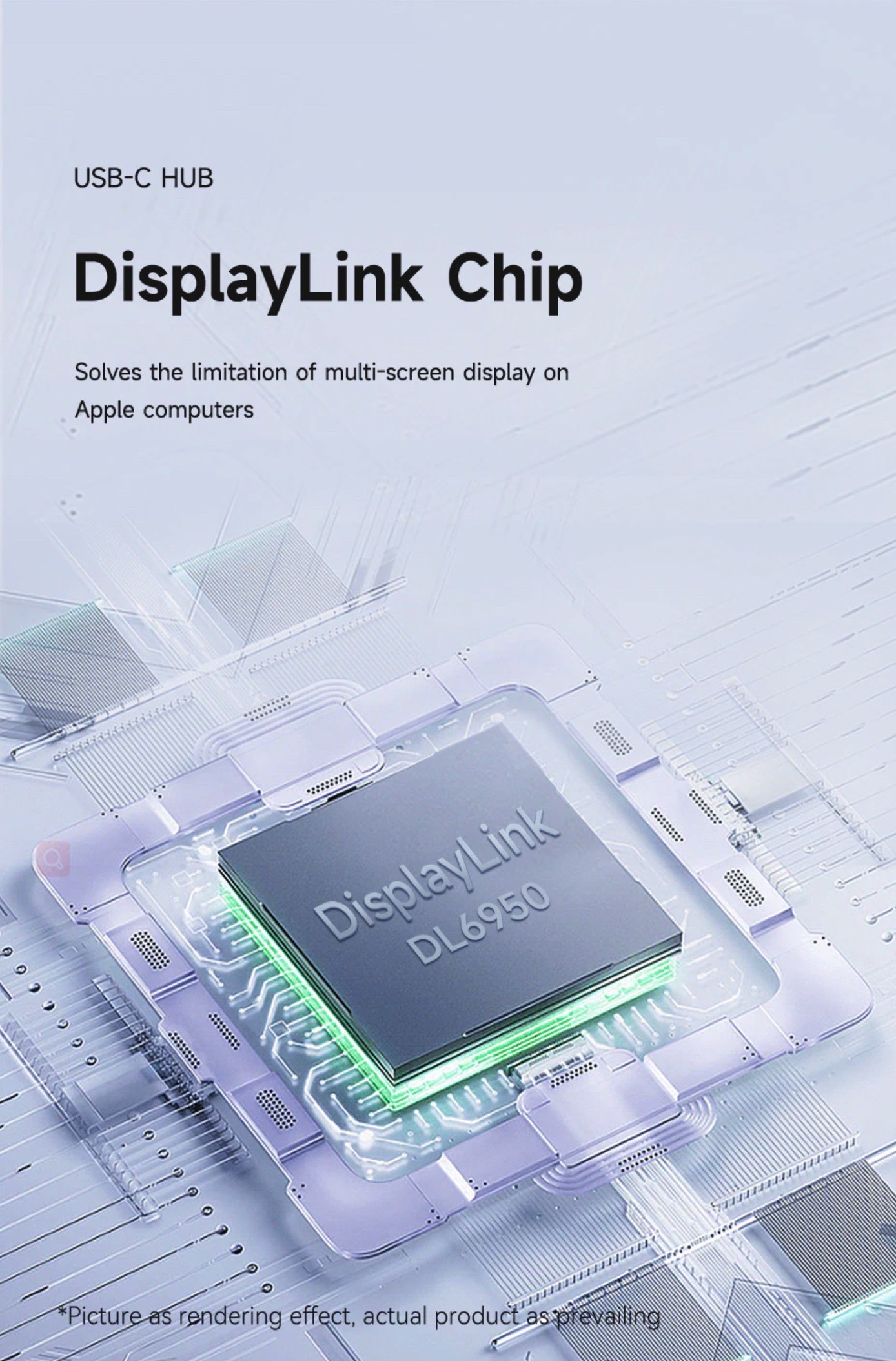 Solve Limitation of MacBook M1/M2/M3/M4: Using the DisplayLink DL6950 chip, making your MacBook not limited by the M1/M2 chip and extending three displays with different content. Also it is compatible with Windows, Chrome OS, Ubuntu, and Android. Note: Must install the DisplayLink driver on your device to ensure proper media display functionality