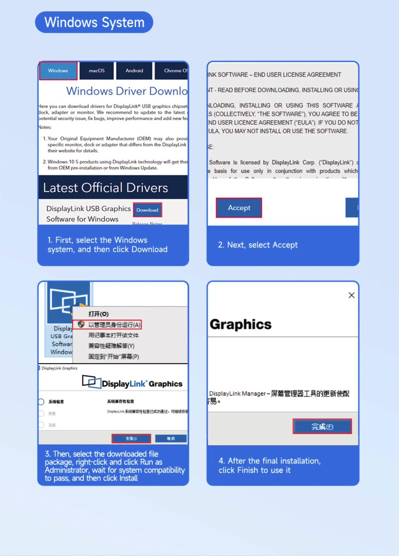 Need to Install DisplayLink: This DisplayLink docking station need to stall Displaylink, The Download URL:"www.displaylink.com". One more thing, before you purchase, make sure your laptop have thunderbolt port or full function USB C port