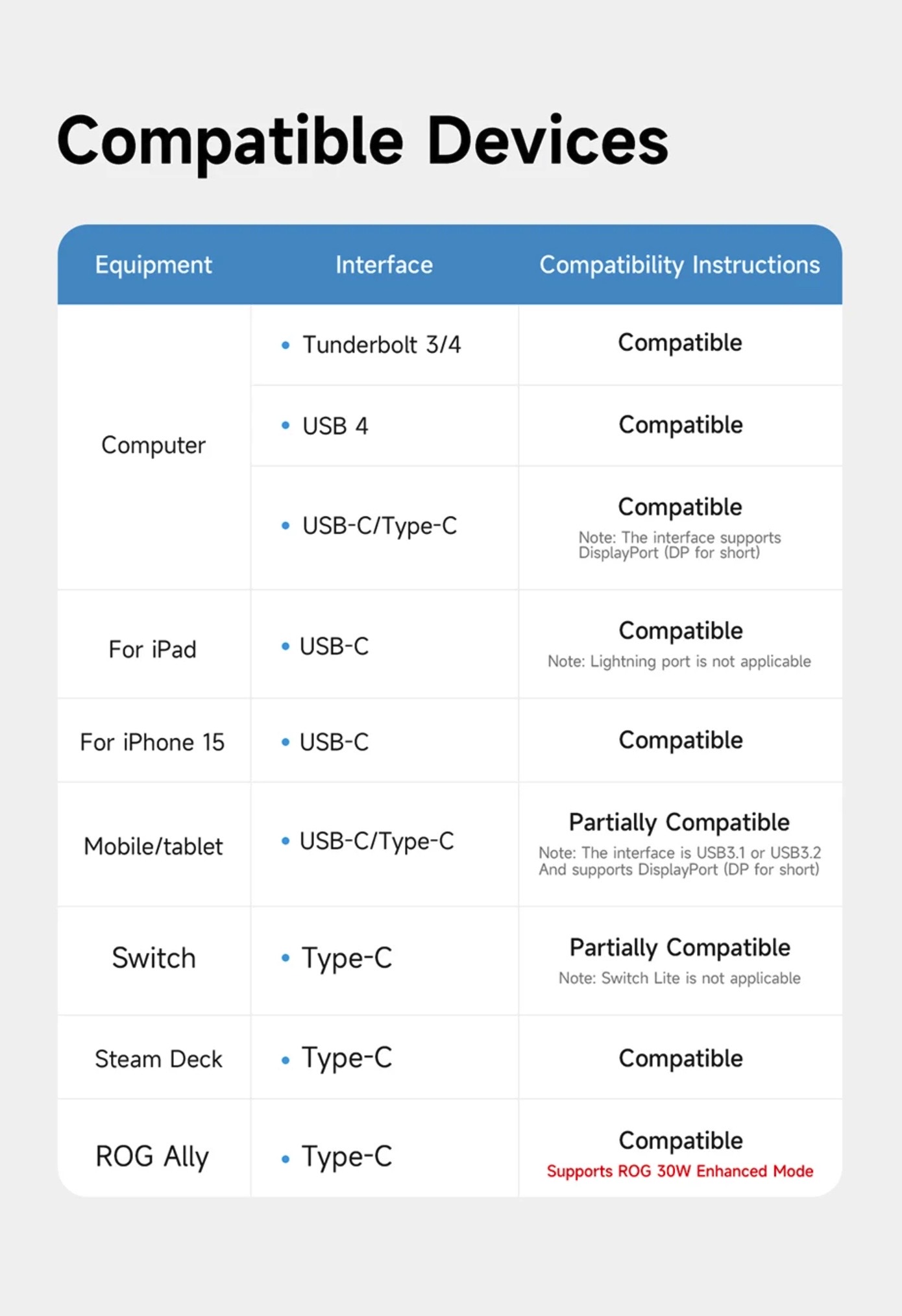 ความเข้ากันได้ที่กว้างขวาง: สำหรับ iPhone 15 Pro Max, M3/M2/M1 MacBook Pro (Pro & Max) ขนาด 14 นิ้ว, 16 นิ้ว, M2/M1 MacBook Air, 2016-2019 MacBook Pro, 2018 MacBook Air, M2/M1 iPad Pro, M1 iPad Air, 2022 iPad รุ่น 10th-Gen, 2021 iPad Pro, 2021 iPad Mini, M1/M2 Mac Mini, 2022 Mac Studio, M3/M1 iMac, 2019/2017 iMac, iMac Pro, 2015-2017 MacBook, Microsoft Surface Laptop 3/Surface Pro 8/Go, Google PixelBook Go, ChromeBook, Galaxy Tab Pro S, HP Spectre Convertible, Razer Blade, Huawei Matebook, USB-C Thunderbolt 3-4, อุปกรณ์ USB4