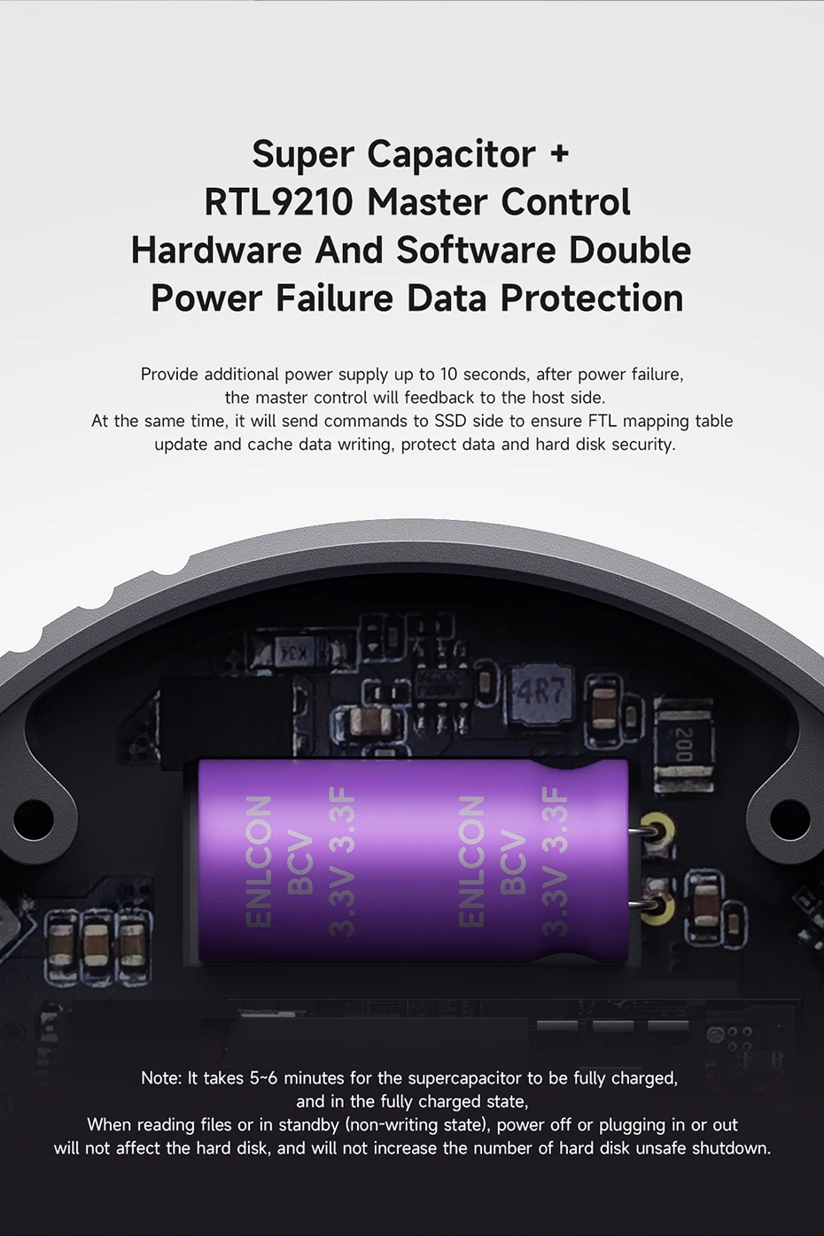 การป้องกันการขาดไฟคู่: การควบคุมหลัก Supercapacitor+RTL9210 พร้อมการป้องกันข้อมูลจากไฟด้วยซอฟต์แวร์และฮาร์ดแวร์สองชั้น เพื่อให้ได้เวลาในการจ่ายไฟเพิ่มเติมอีก 10 วินาทีหลังจากไฟดับ การควบคุมหลักจะให้ข้อเสนอคืนไปยังโฮสต์และส่งคำสั่งไปยัง SSD เพื่อให้แน่ใจว่ามีการอัปเดตตารางการจับคู่ FTL และการเขียนข้อมูลแคช ป้องกันข้อมูลและความปลอดภัยของฮาร์ดดิสก์ *หมายเหตุ: การชาร์จสุรพัทธ์จะใช้เวลา 5-6 นาทีเมื่อเต็มที่ เมื่อเต็มที่ จะไม่มีผลต่อฮาร์ดไดร์ซซฟหลังจากการอ่านไฟล์หรืออยู่ในโหมดสแตนด์บาย (ไม่ใช่ในโหมดเขียน) ปิดไฟหรือถอดปลั๊กและมันจะไม่เพิ่มจำนวนการปิดหลังการดับไฟของฮาร์ดดิสก์