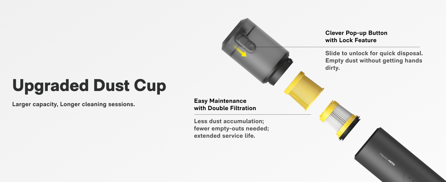 - THREE SUCTION MODES & POP-TO-OPEN DUST CUP: Three adjustable levels(8000 pa/1500 pa/20000 pa)with one-touch control for different cleaning needs. Built in 2,500 mAh lithium battery, the HOTO rechargeable hand vacuum delivers up to 35 min runtime. Pop-to-Open buckle design with lock-up mechanism for hassle-free dust disposal