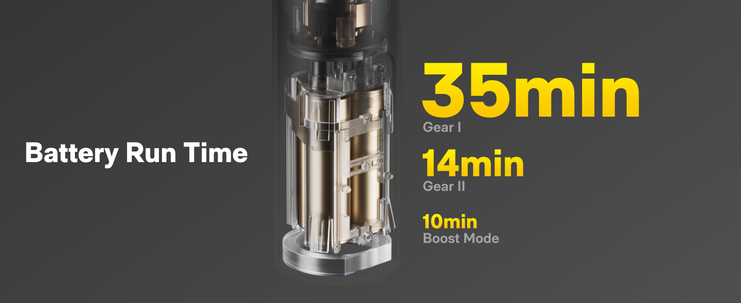 โหมดการดูด 3 ระดับ & ถังฝุ่นแบบเปิดได้ด้วยปุ่มเดียว: ปรับพลังดูดได้ 3 ระดับ (8000 Pa / 15000 Pa / 20000 Pa) ด้วยการควบคุมผ่านปุ่มเดียว มาพร้อมแบตเตอรี่ลิเธียม 2,500 mAh ใช้งานได้นานสูงสุด 35 นาที และมีดีไซน์ฝาถังฝุ่นแบบ Pop-to-Open พร้อมระบบล็อกเพื่อการทิ้งฝุ่นที่สะดวก