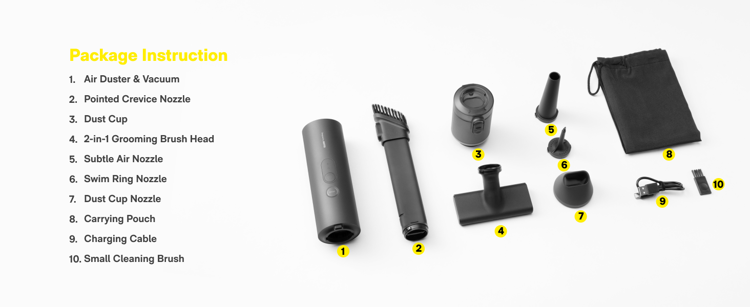 - FIVE MULTI-ACCESSORIES FOR ANY CLEANING CHALLENGE: 2-in-1 grooming brush head for hair on sofas, carpets, car seats.Pointed crevice nozzle for narrow deep gaps like car seat gaps, keyboard spaces.Subtle air nozzle for vacuuming and blowing. Dust cup nozzle for large debris.Swim ring nozzle for inflating